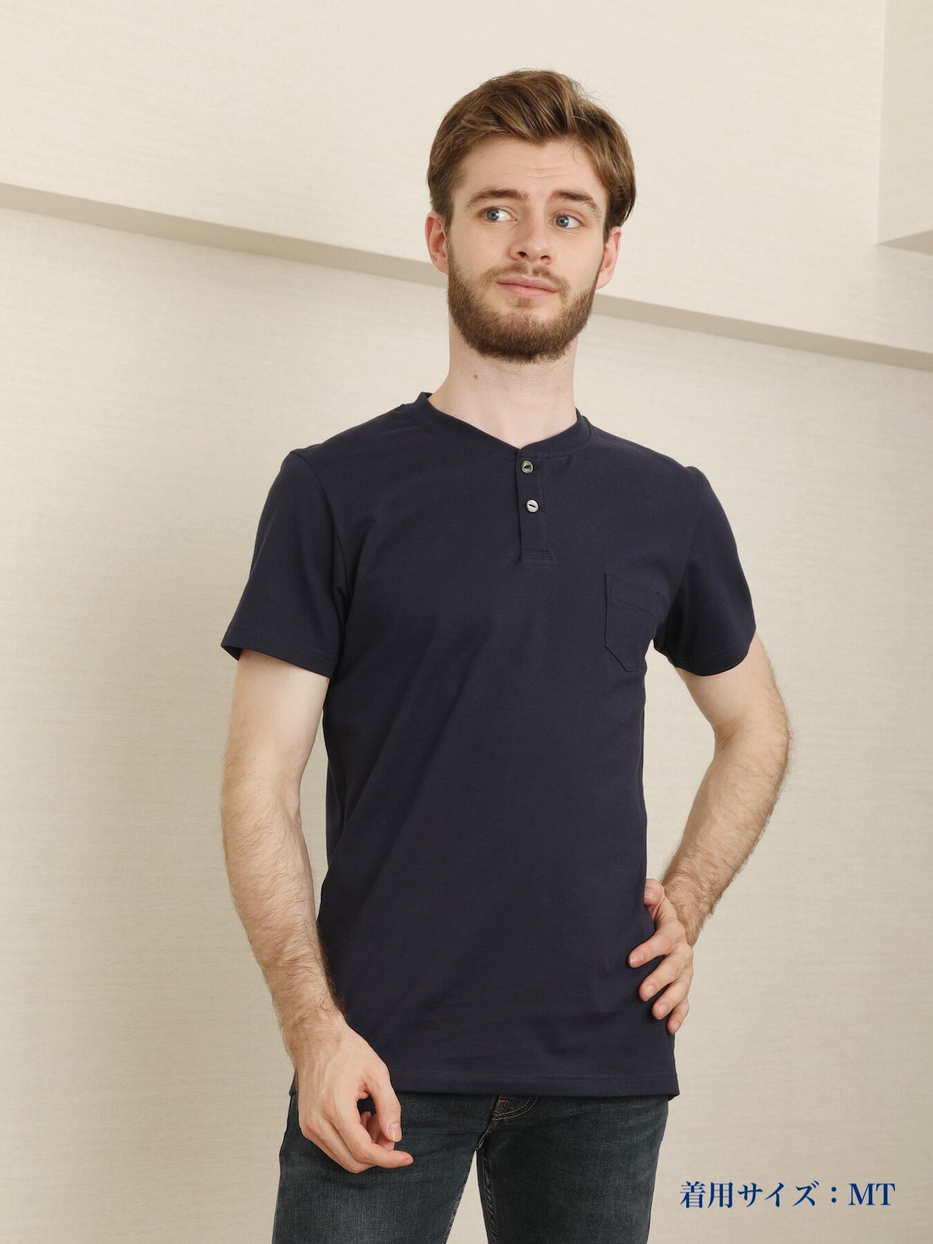 ①「ちび衿」のような衿腰の高いヘンリーネックでJKやブルゾンとコーデしても綺麗に収まり、1枚で着てもドカジュアルにならない存在感